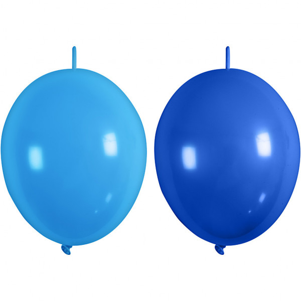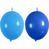Solid coloured, round balloons in natural rubber. Each one has an elongation at the opposite end of the nozzle to connect with other inflated balloons, creating a chain.