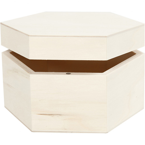 Hexagonal box of light wood with magnetic lock.