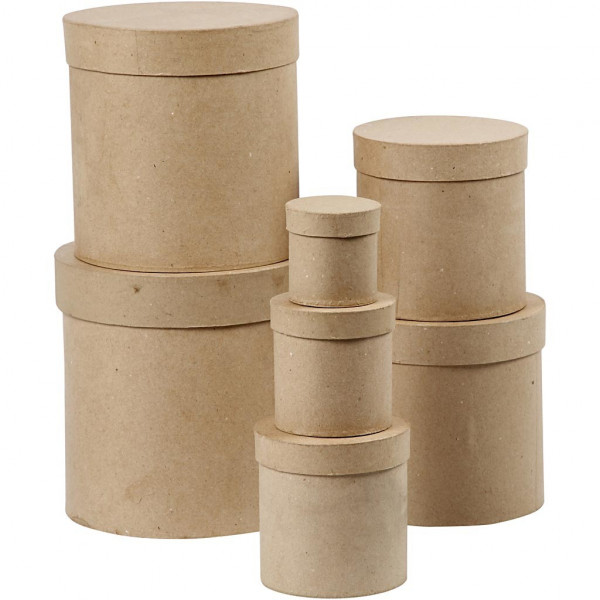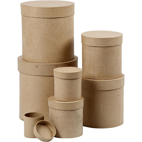An assortment of round, hand-made boxes made of papier-mâché.
