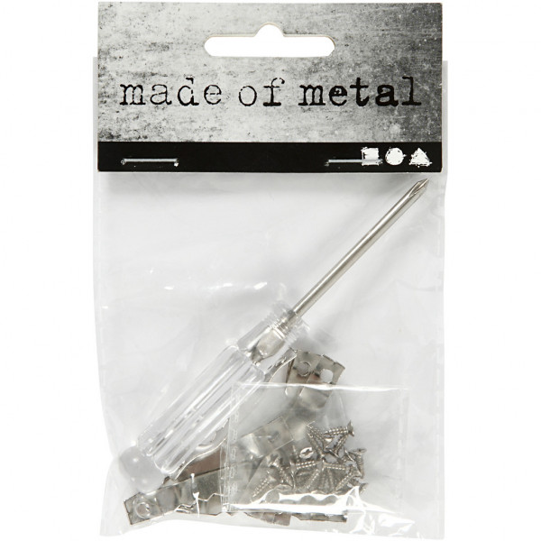 Pack with 10 pcs. brackets, 20 pcs. matching screws and 1 pcs. screwdriver.