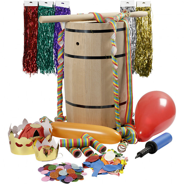 Contents: 1 large barrel, 1 bat, 1 kings crown, 1 queens crown, self-adhesive decoration of sparkling EVA foam, party streamers, tinsel, balloons and a practical balloon pump.