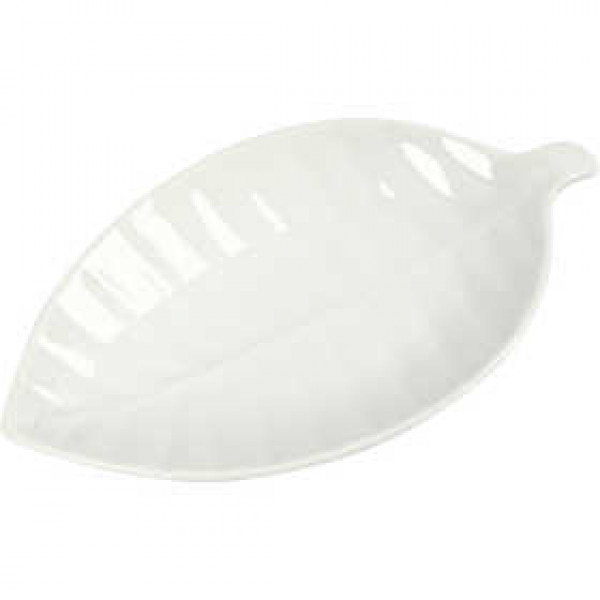 Long dish made of glazed ceramic which is shaped like a leaf.