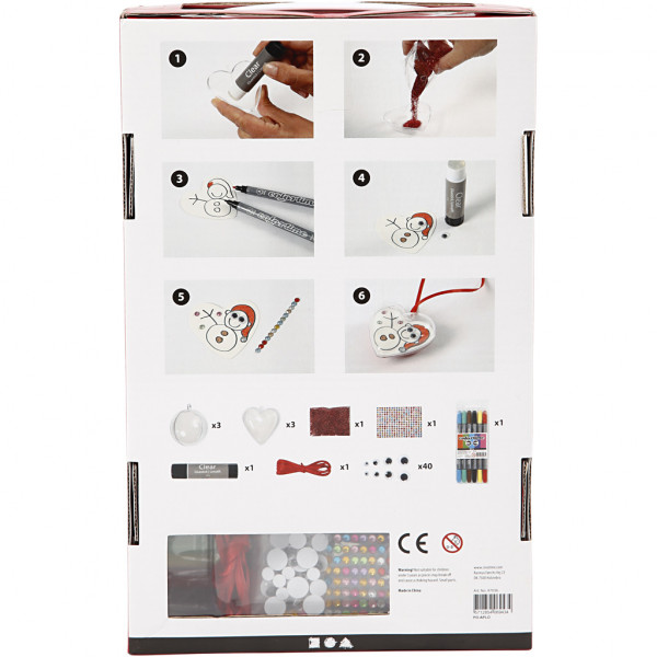 Pack has 3 spheres, 3 hearts, 20g Red glitter, 1 clear glue stick, 15m red satin ribbon, 1 pk Colourtime double-markers, rhinestones and 40 assorted googly eyes.