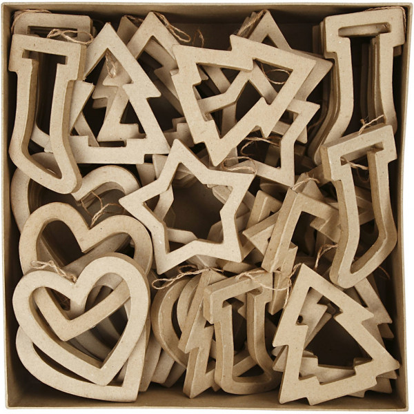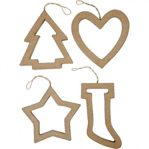 Christmas ornaments made of papier-mâché with jute string for hanging.