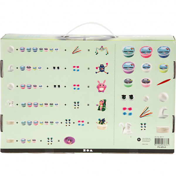 Contents: 1 animals and other items of styrofoam, 1 box of wood veneer, Foam Clay® and Silk Clay® in assorted. colours, chenille and 5 pairs of eyes.