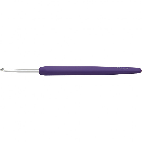 Ergonomic crochet hook of aluminum, with soft touch plastic handle.