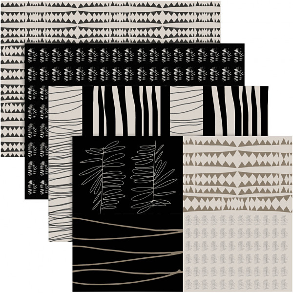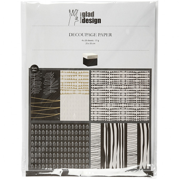 An assortment of single-sided, semi-transparent decoupage paper with prints from the Glad Design series.