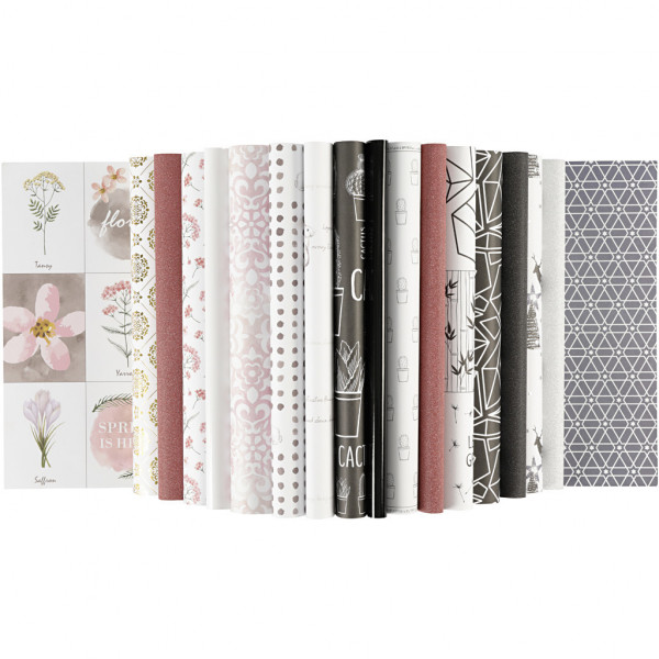 Content: 36 sheets in the following breakdown: 1-sided paper (128g/m2) 3 x 2 and 3 x 2 with varnish glitter. 1-sided paper (120g/m2) 2 x 2 with metal foil in gold and 20 assorted sheets in 10 different patterns.