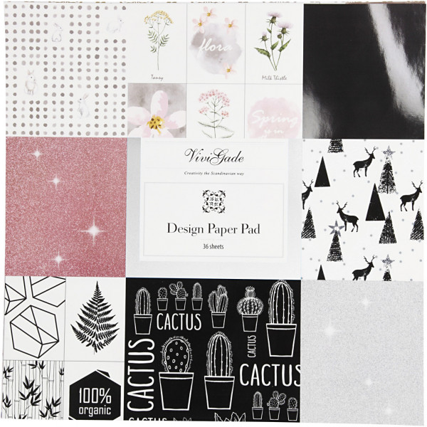 Pad with 36 square sheets in 18 different designs from the Vivi Gade. Consists of paper with one side printed with patterns, without the detail of the metal foil. In addition the entire surface is printed.