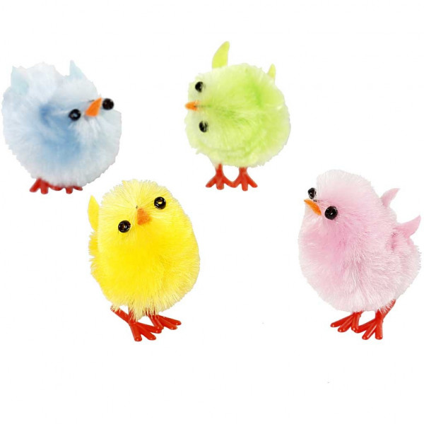 Small chickens of chenille with plastic legs.