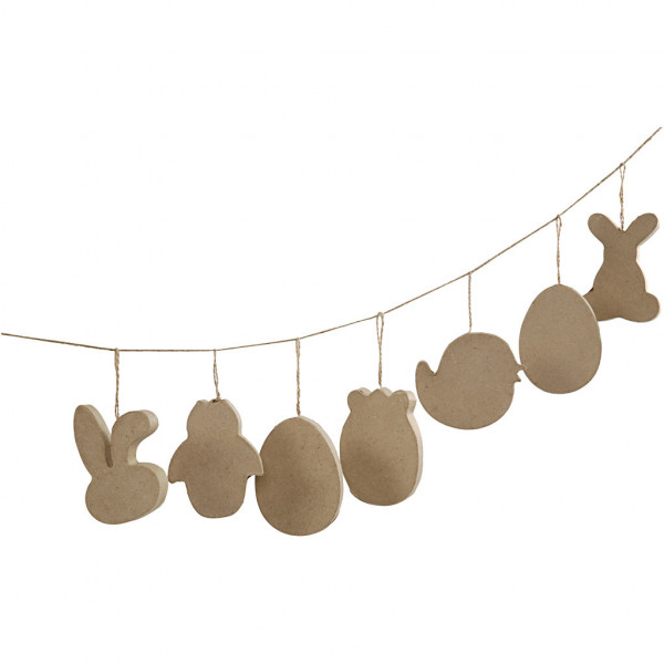 Handmade Easter ornaments of papier-mâché with string for hanging.