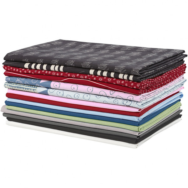 Pack with 6 different printed designs each of 2 meter and 9 different solid colored fabric each of 2 meter.