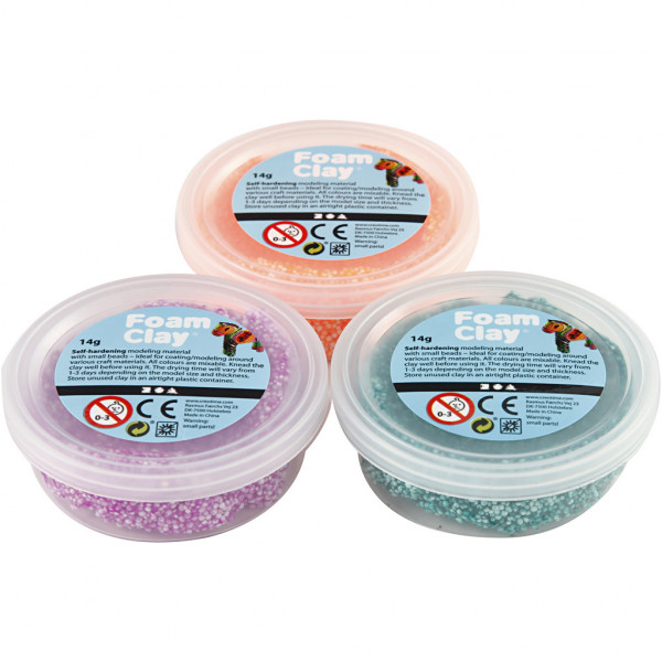 An assortment of self-hardening modelling material with small bead-like texture - ideal for coating/modelling craft materials. Packed in practical tubs - store the unused clay in an airtight container to prevent drying-out.