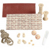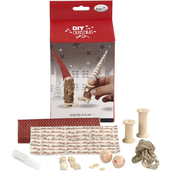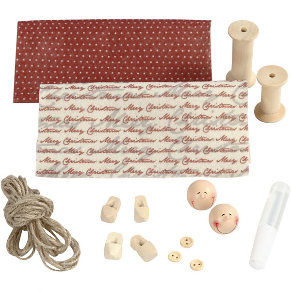 Contents: 2 wooden reels H: 38 & 50mm, 2 wood faces, 2 pairs of clogs, 3 wooden buttons, natural twine, design felt and Clear Multi Glue.