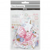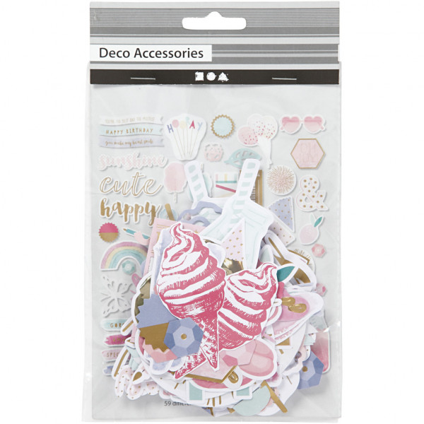 Small embellishments with motifs in multiple sizes made of punched card. All printed with colours, many with gold foil. Can be used for decoration and scrapbooking.