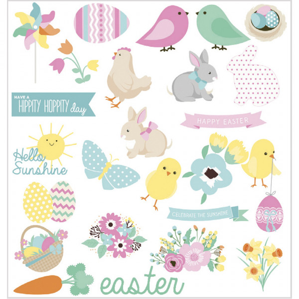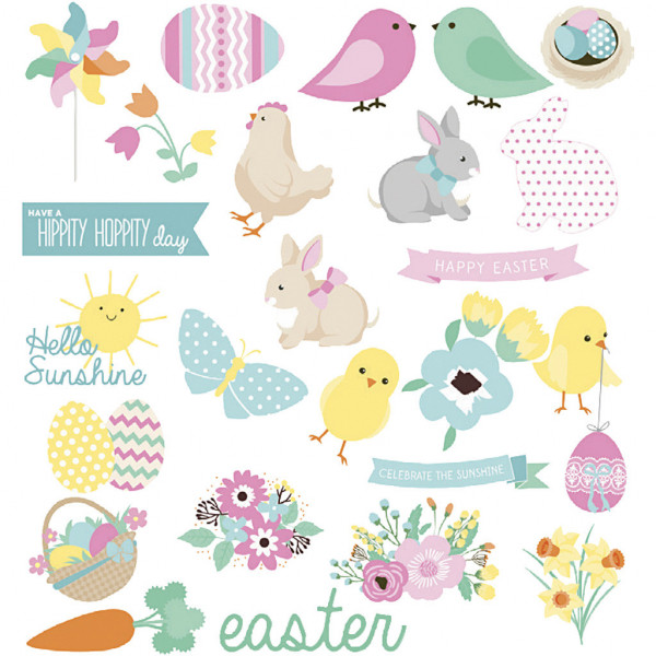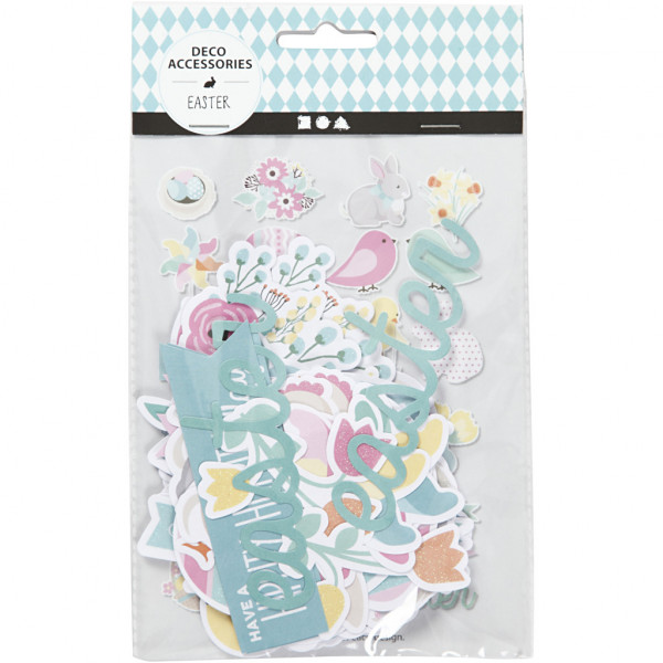 Small embellishments with motifs in multiple sizes made of punched card. All printed with colours, many with gold foil. Can be used for decoration and scrapbooking.