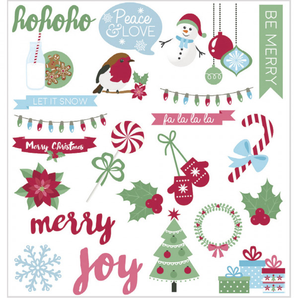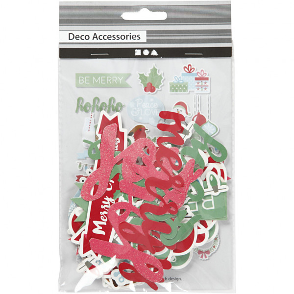 Small embellishments with motifs in multiple sizes made of punched card. All printed with colours, many with gold foil. Can be used for decoration and scrapbooking.
