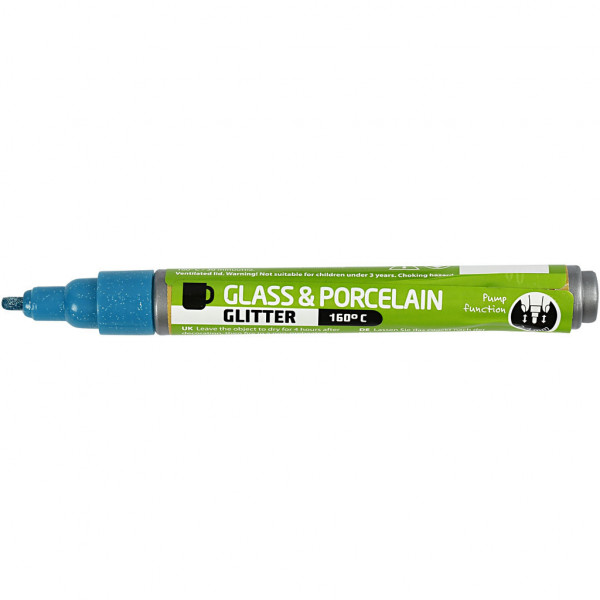 Semi-transparent, water based glass and Porcelain marker with glitter for both glass, metal and porcelain.