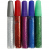 Assortment of glitter glue in squeezable clear plastic tubes with nozzle.