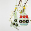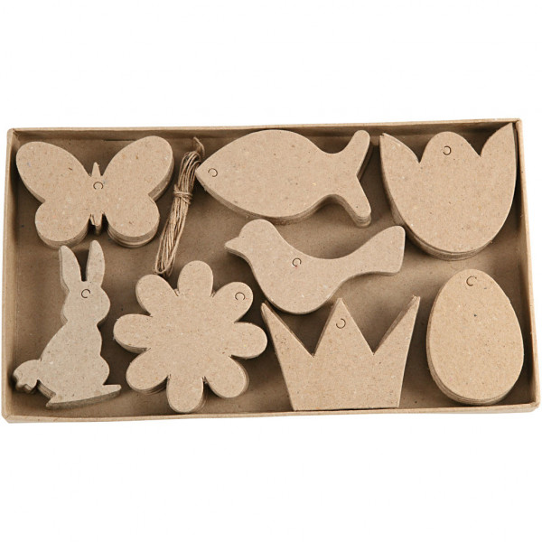 Flat, hand-made papier-mâché hanging decorations with a jute string.