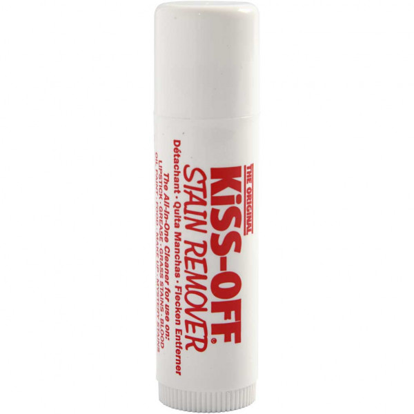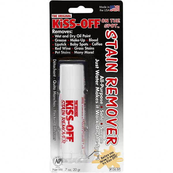 Kiss-Off Stain Remover removes stains on the spot. It is unique because it only needs water to remove tough stains, including grease, lipstick, blood, grass stains, wine, coffee and more! No harmful fumes, no liquid to spill!.