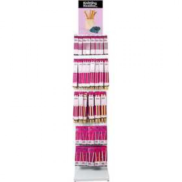 An assortment of different knitting needles. Top sign is included.