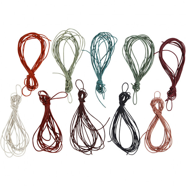 An assortment of good quality dyed round leather cord containing 10 asstd. colours each of 3 m.