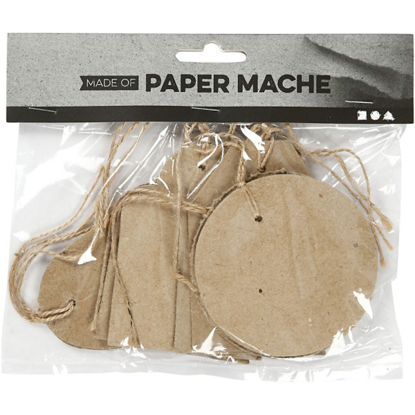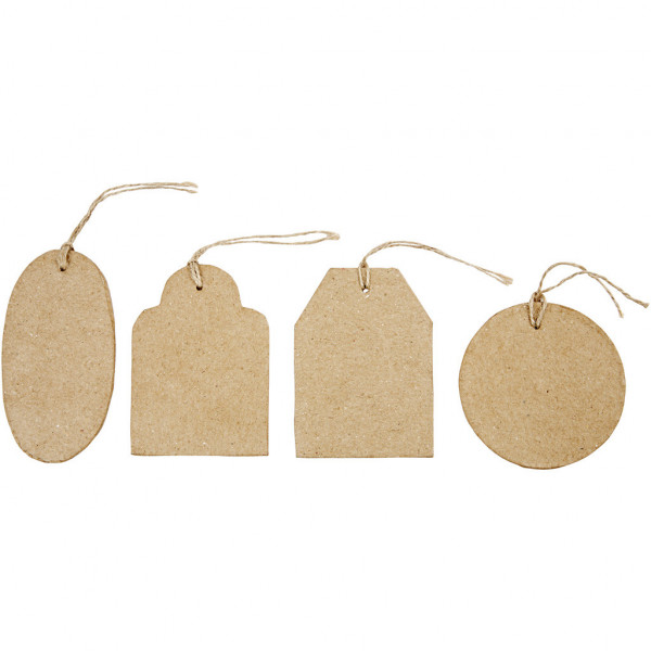 papier-mâché Manila tags with jute string.