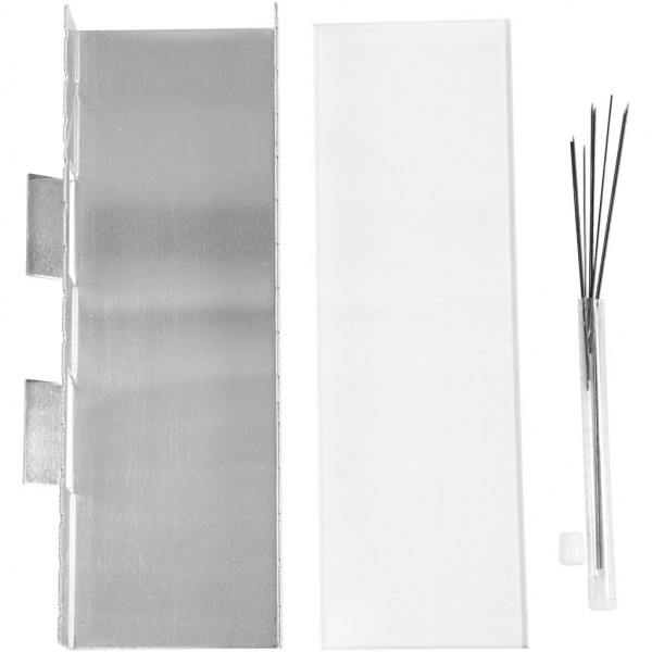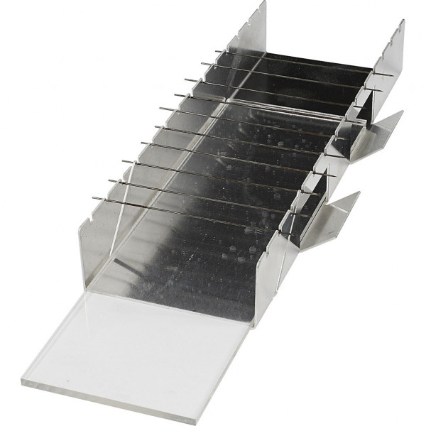 Contents: mitre box in stainless steel with cut grooves and holes for hanging pearl pins, acrylic plate, and 12 pcs. pearl pins.