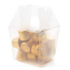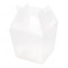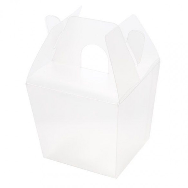 Cute is as cute does. The design of this mini takeout box creates an adorable display for treats and favors. The FS281 box measures 60 x 51 x 54 mm and comes in a frosted finish for a unique look. Package candy, cookies, crafts, jewelry, and gifts. This box will hold two mini macaron cookies and is perfect for favors. The gable-top style and die-cut handle offer an eye-catching presentation. The semi-transparent material offers a classy look and is 300 micron thick for outstanding durability. Shape along folds and secure the bottom tabs to assemble. Clear stickers are included for a theft-proof closure. Food safe.