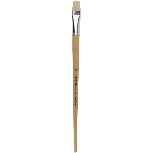 Flat hog-hair bristle brush with long, lacquered wooden handle - ideal for use with heavy-bodied paints.