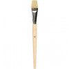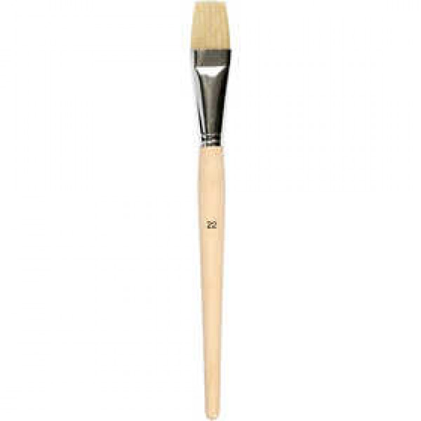 A flat hog-hair bristle brush with short, non-lacquered wooden handle - ideal for use with heavy-bodied paints.