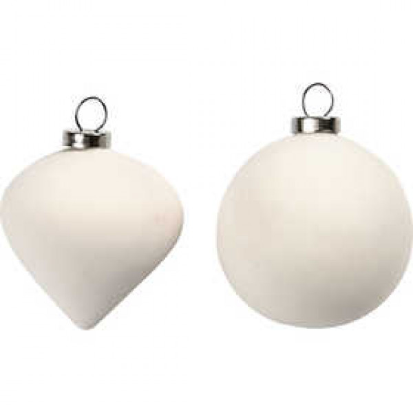 Ornaments of raw, white terracotta with metal collar and an eye for hanging. Pack with 2 designs each of 6 pcs.
