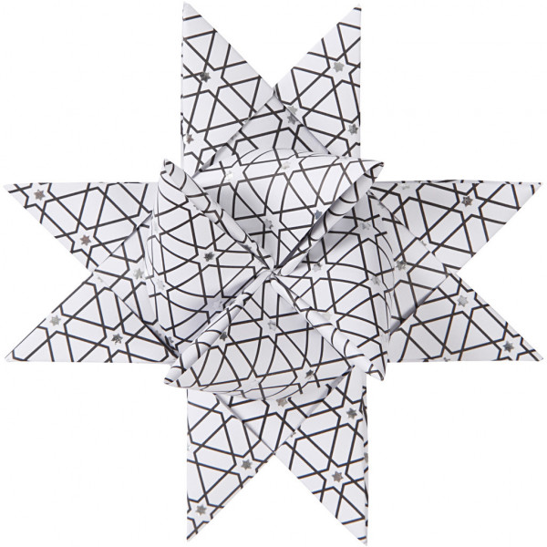 An assortment of two-dimensional multi-coloured paper strips with 2-sided paper in a total of four different designs with 2-sided printing and fine details in metallic foil. Diameter indicates the finish stars' size. Instructions included.