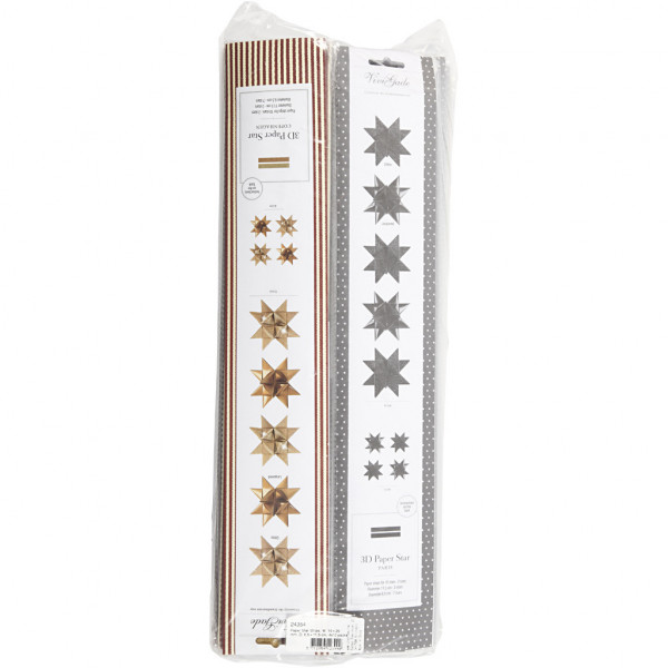 An assortment of two-dimensional multi-coloured paper strips in a design from Vivi Gade, for a total of 4 colours with lacquer and glitter on 2-sided printing. Diameter indicates the finish stars' size. Instruction included.