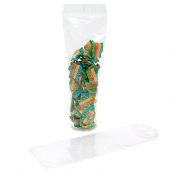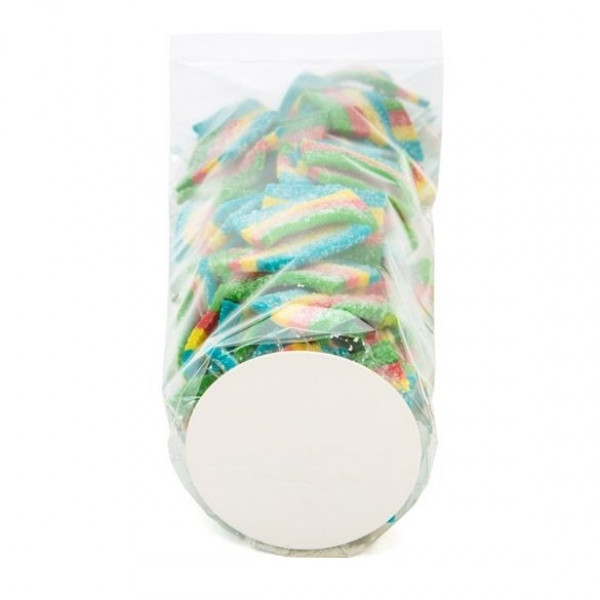 Our crystal clear round bottom bags are popular for bulk candy and treats. The RPBG1 bag measures 5,1 x 25,4 cm and works great for jelly beans, marshmallows, gummy bears, small cookies, gifts, and more. This bag is 40 micron thick and is made of high-quality BOPP for superb clarity and durability. The round shape and the white paper base offers an upright, classy presentation. The paper base is 250 gsm and offers a sturdy, flat base to place your candy. Bags are heat sealable. Ribbons and stretch loops can also be used to close and/or accessorize this bag for an attractive finish. Food safe.