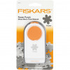 Heavy punch from Fiskars. Punches wood veneer (max 1 mm), cork (max 1 mm), artificial leather (max 0.9 mm), corrugated cardboard (max. 1.38 mm), cardboard (max. 2.4 mm) and EVA Foam (max 1.5 mm).
