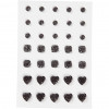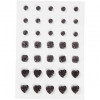 An assortment of self-adhesive rhinestones in a design from Vivi Gade with a raise front and a flat back on sheets in 3 designs (round, square, heart).