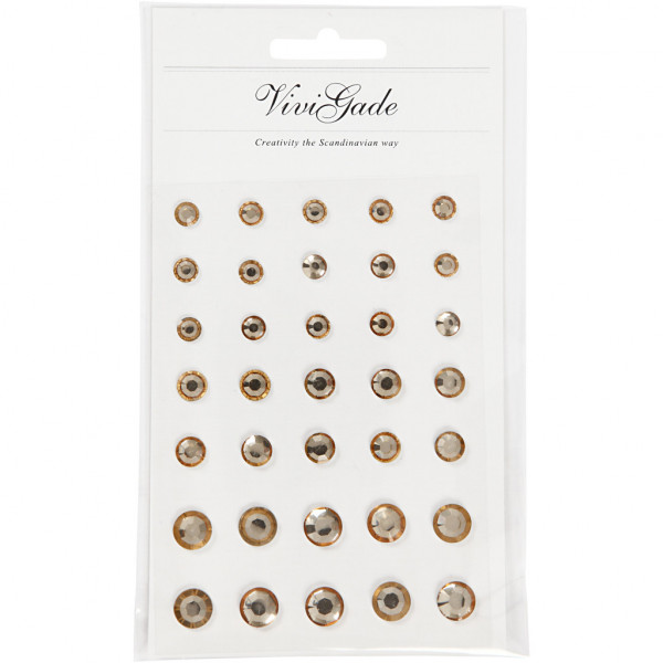 An assortment of self-adhesive rhinestones in a design from Vivi Gade with a facet lace front and a flat back in 3 sizes.