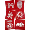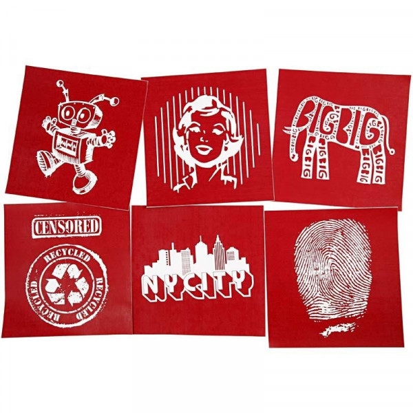 An assortment of screen stencils for printing on textiles, canvas, etc. Clean with water and the stencil can be reused.
