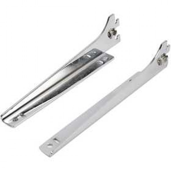 Shelf brackets in polished chrome for mounting on wall rail with locking screws.