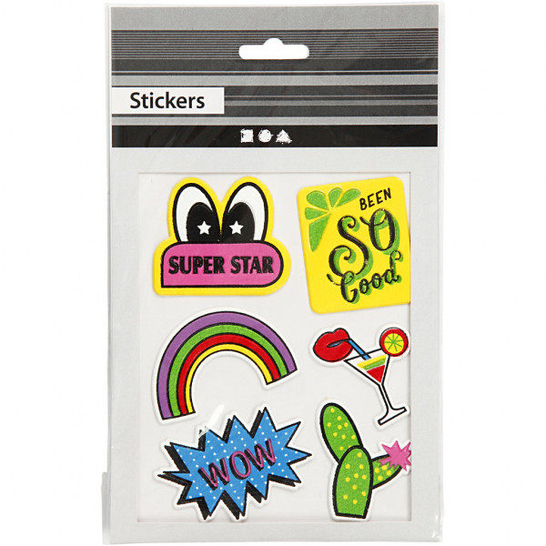 Self-adhesive stickers made of plastic, printed with colourful motifs. Used for decoration on bags, mobile covers and shoes.