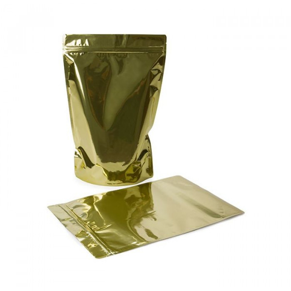 The ZBGM6SG is our largest stock metallized zipper pouch size. It' on shelf measurements (outer dimensions) are 229x121x343mm and has 216 x 102 x 298mm of usable space (inner dimensions). Holding 2lb, 907g (based on whole coffee beans), this bag is perfect for large quantities of bulk foods such as bean, rice, candies, cookies, etc. The unique tri-blend metallized material provides our highest barrier protection. It is airtight, holds in flavors and is smell and moisture proof. The heat sealable top comes with pre-opened zippers for easy loading and tear notches for easy opening. A unique shimmer gold color will help it stand out on shelf and can be custom printed on for additional branding.