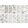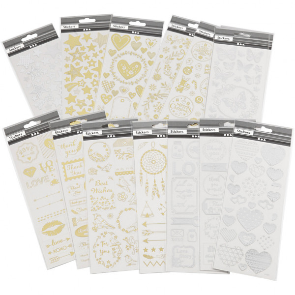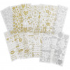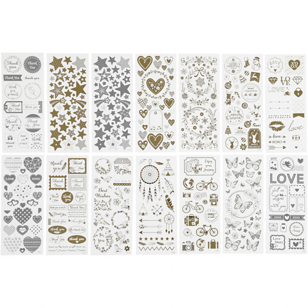 An assortment of self-adhesive stickers with motifs in silver or gold foil on thin and clear plastic foil.