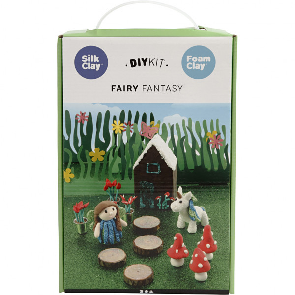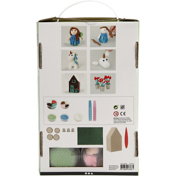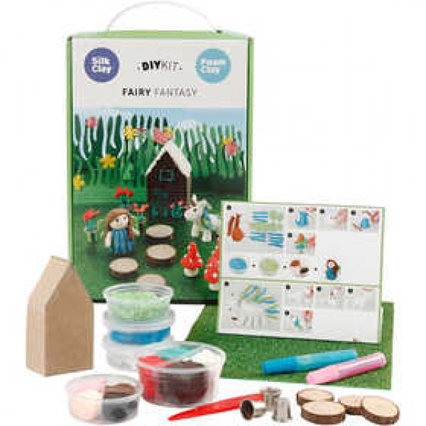 Contents: Foam Clay and Silk Clay in several colours to make fairy, unicorn and toadstools. Plus glitter glue, small wooden discs, glitter foam rubber to create the 'forest floor', thimbles as 'pots' and a house of papier mache.