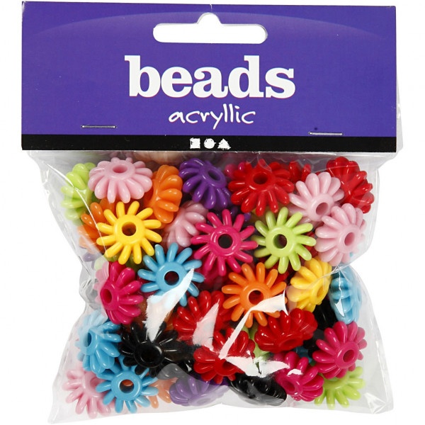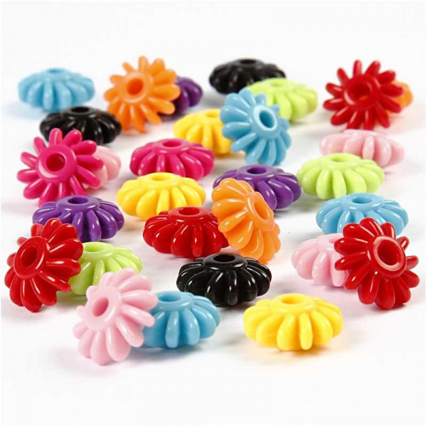 Plastic beads in wheel shape. Pack with 9 colours.