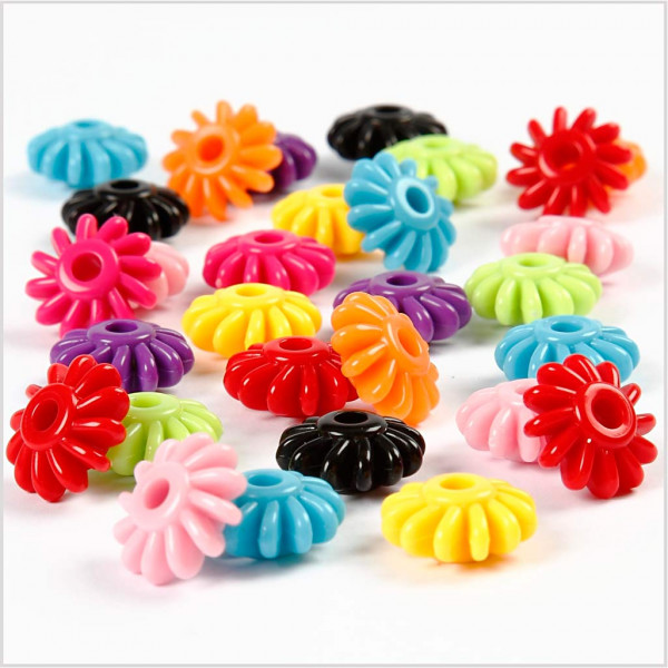 Plastic beads in wheel shape. Pack with 9 Colours.