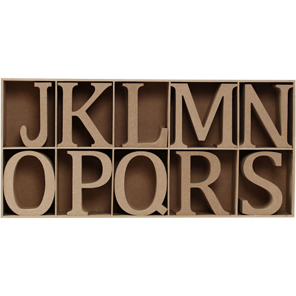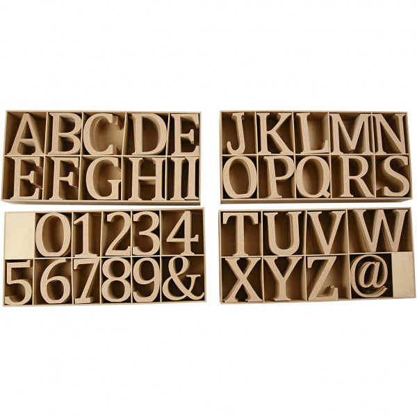 Supplied in 4 display boxes with 6 pcs. of each letter A-Z (12 pcs. E, 12 pcs. I), 0-9, &, @.