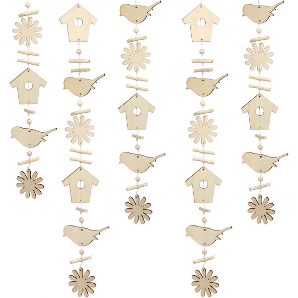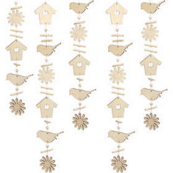 Contents: 20 pieces of wooden beads, 15 pcs. deco sticks and 6 asstd. figures (flower, bird, house). Supplied in a plastic bag with header card.